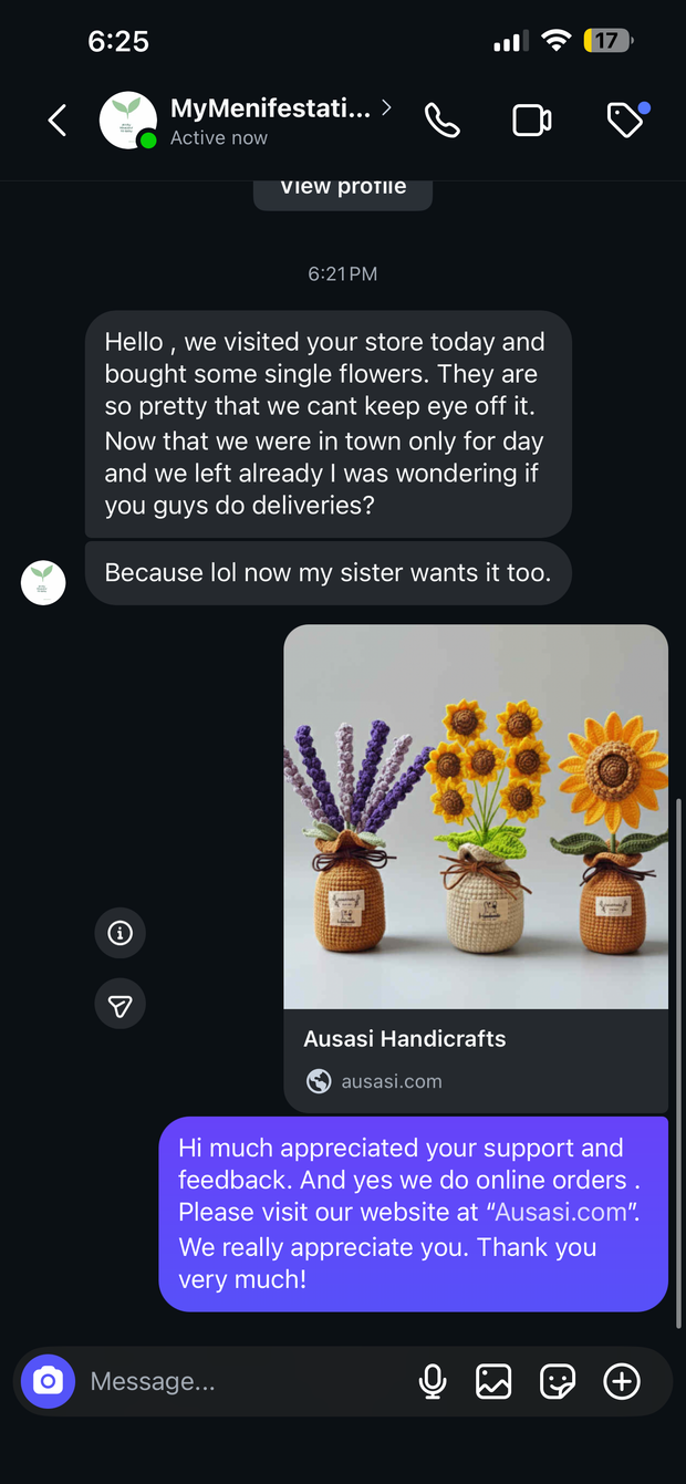Crochet has always been part of my family’s story - first in my grandma’s hands, then my mom’s, and now mine. They made sweaters and hats for me and my sister every winter, each stitch filled with care. Today, I carry that tradition forward through Ausasi Handicrafts, sharing the same love and craft with the world.