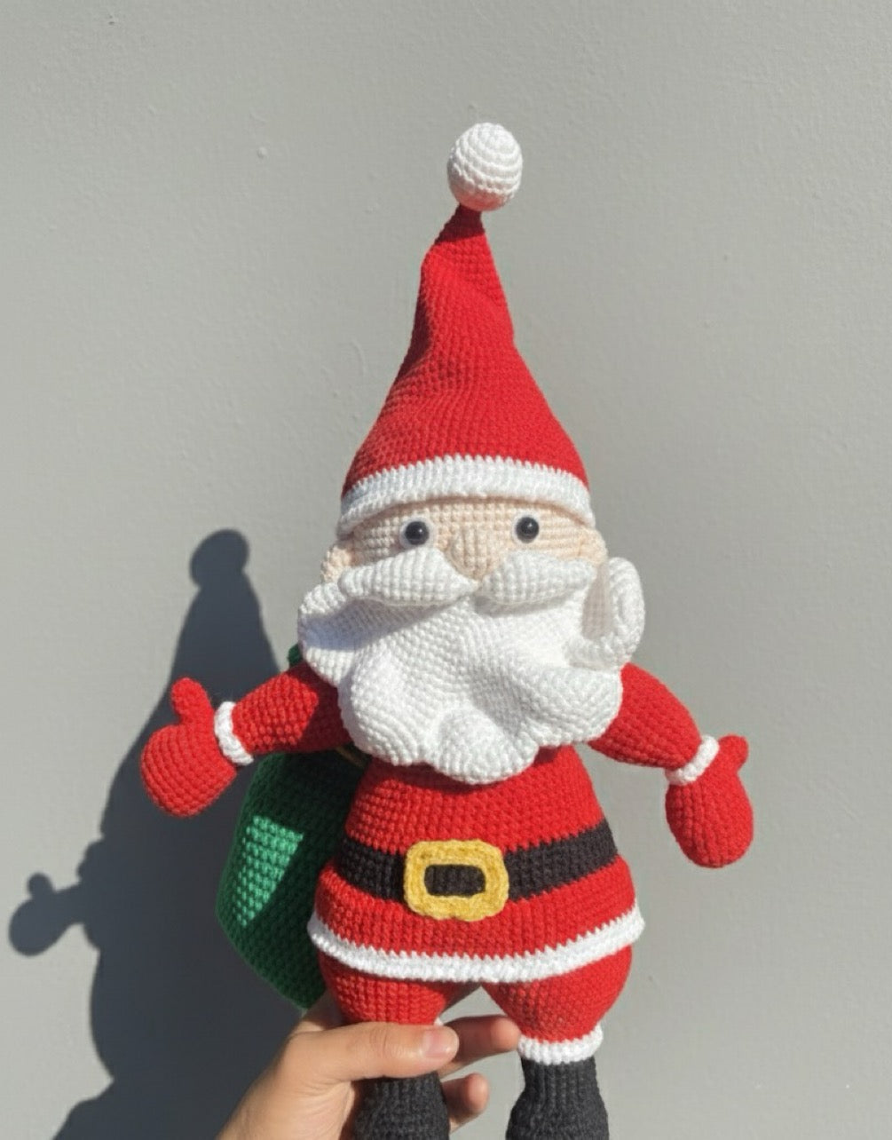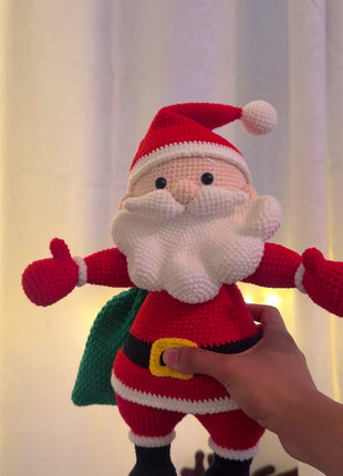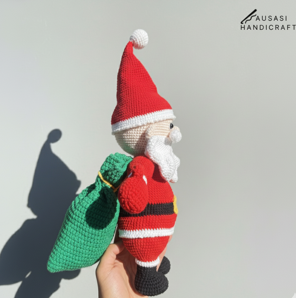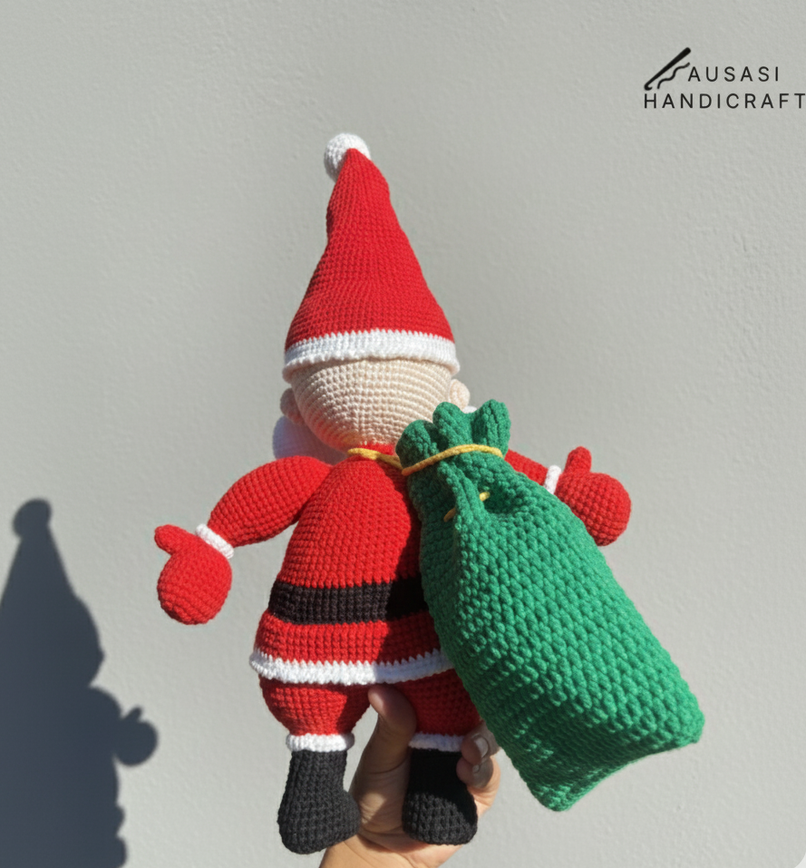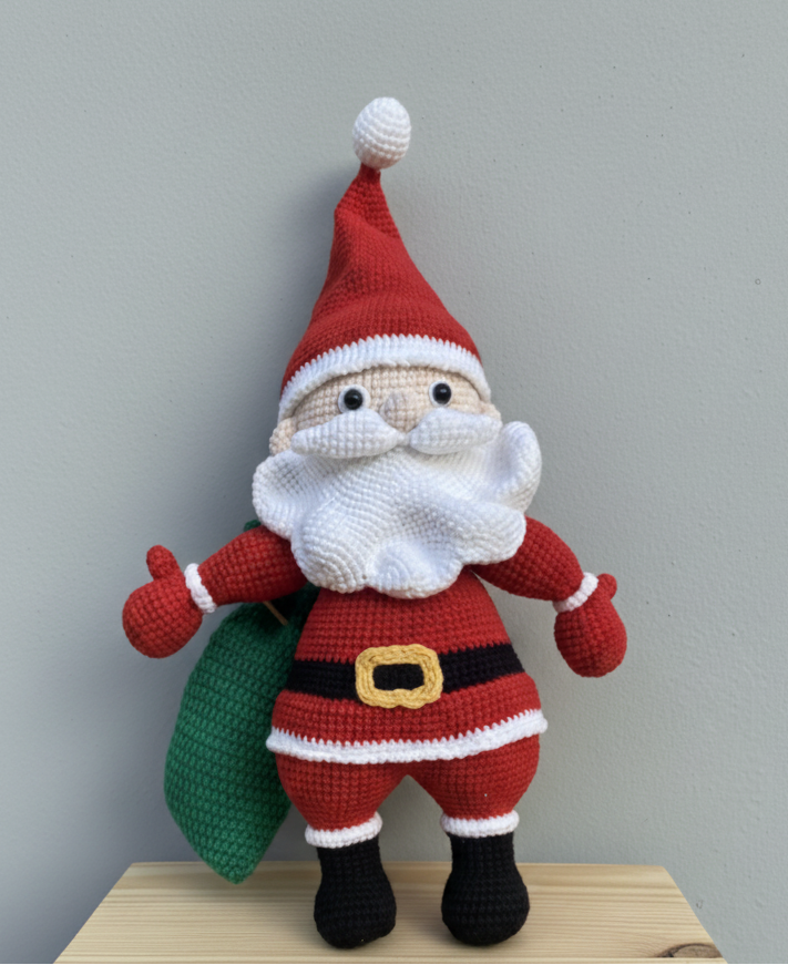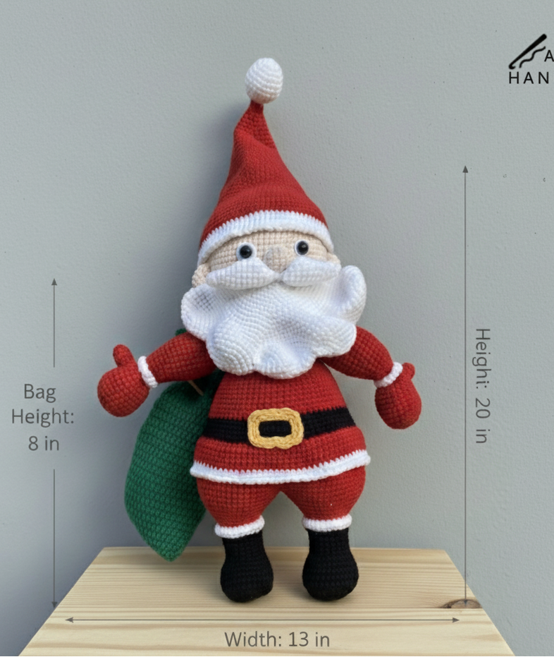 This handmade crochet Santa is a true showpiece for the holiday season. Standing tall at 20 inches, with a width of 13 inches and a green gift bag measuring 8 inches, he’s the perfect mix of festive charm and craftsmanship. Every stitch is tightly crocheted by hand, giving the piece a premium, durable feel while keeping its soft and cozy look.