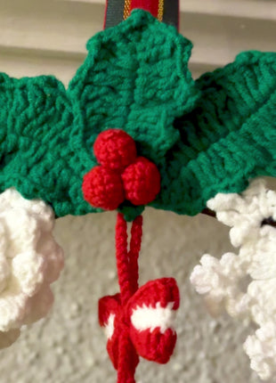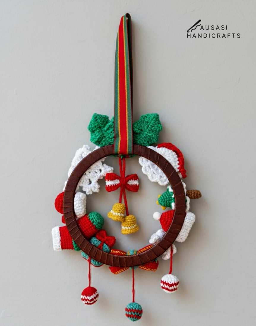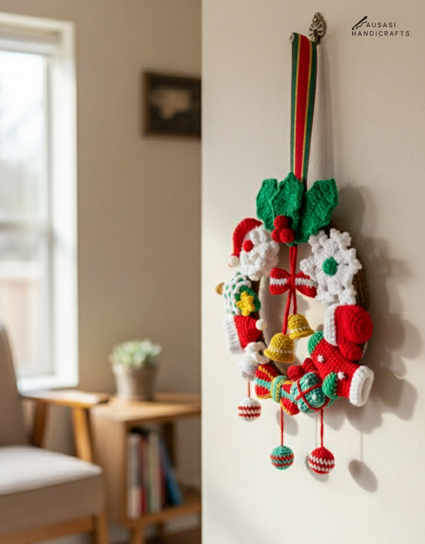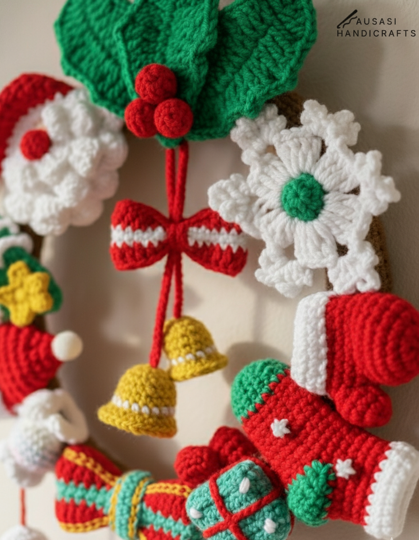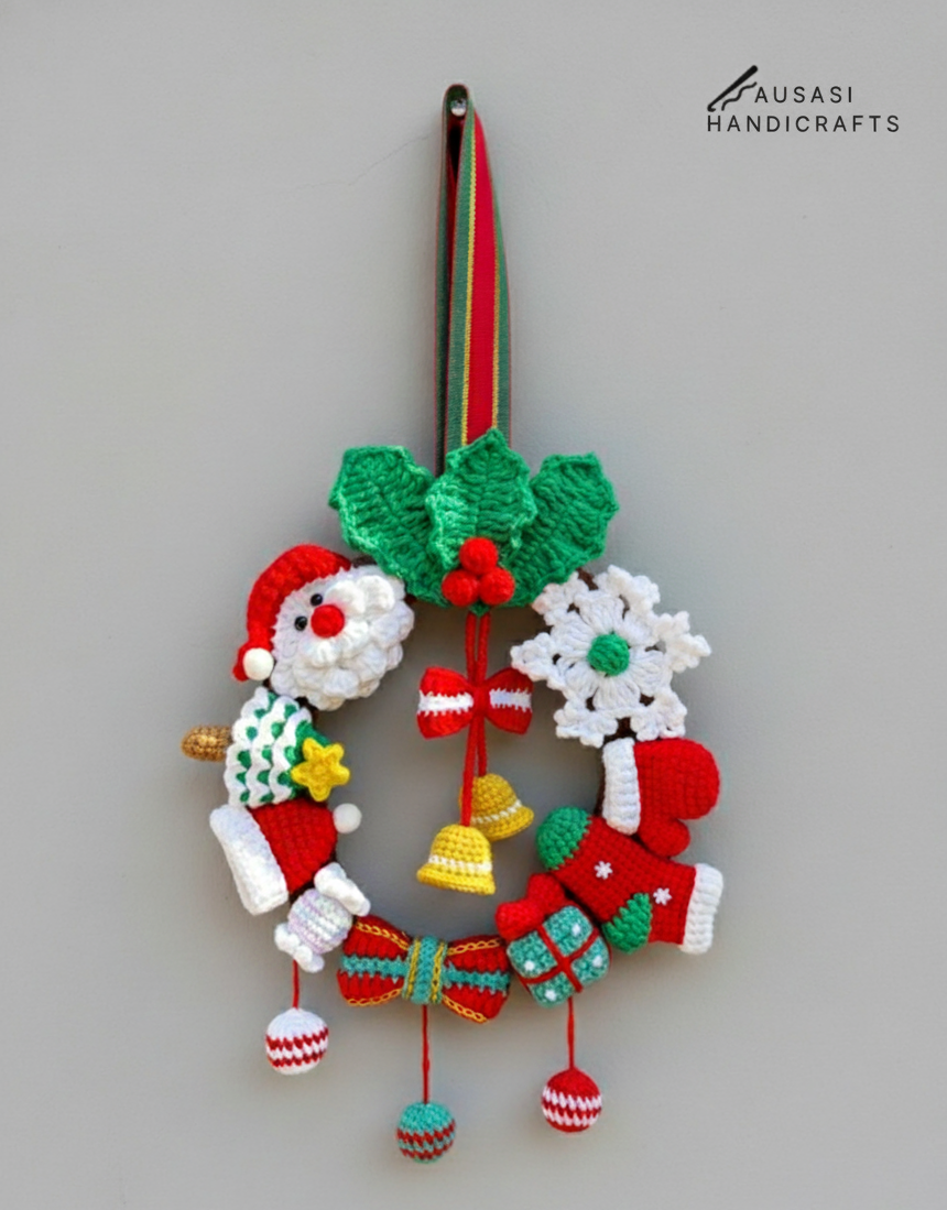 Each wreath features a delightful mix of crochet elements — Santa, stockings, gifts, bows, bells, and snowflakes — all arranged in a vibrant, festive design. The hanging details add movement and charm, making it a perfect centerpiece for your front door, wall, or mantle.