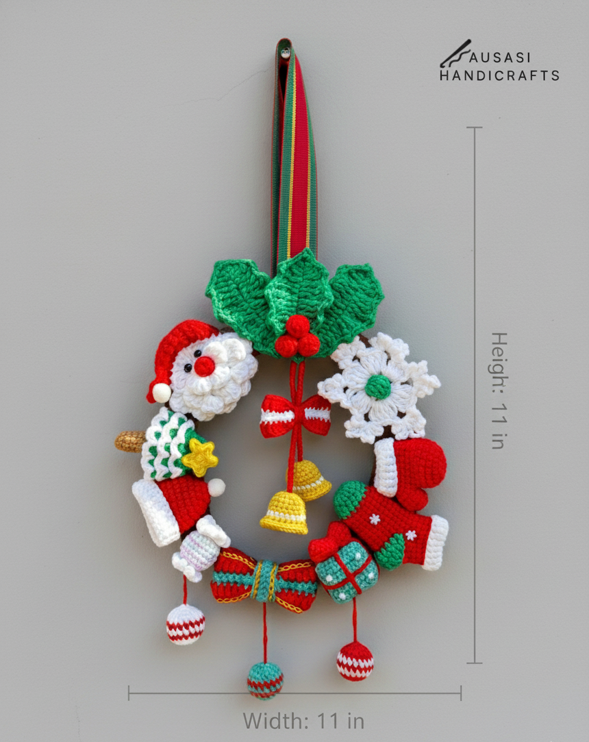This handmade crochet Christmas wreath is a joyful blend of color, creativity, and holiday cheer. Measuring about 11 inches in both height and width, it’s beautifully handcrafted in Texas using premium yarn and detailed stitching.