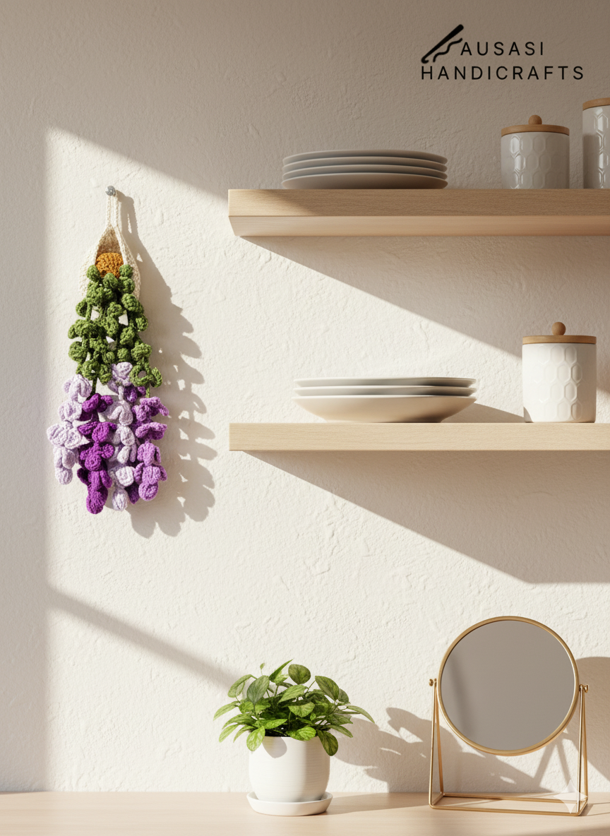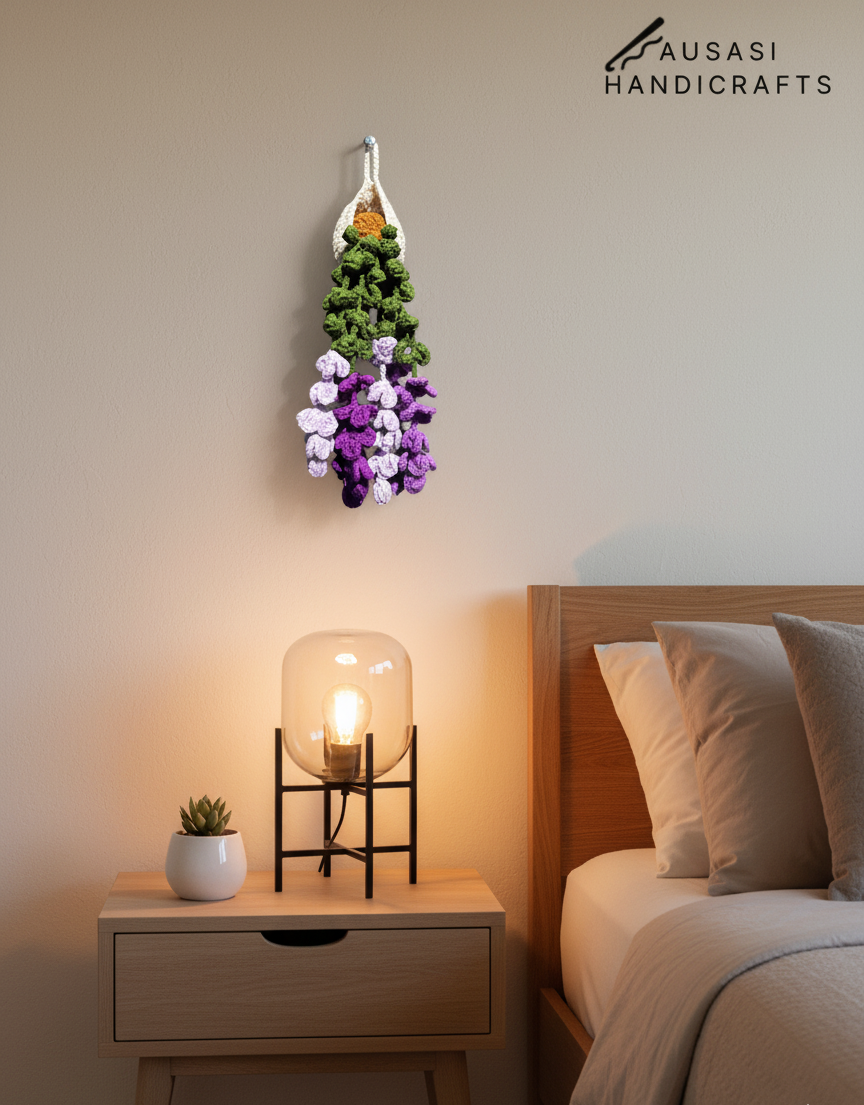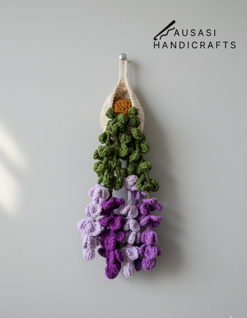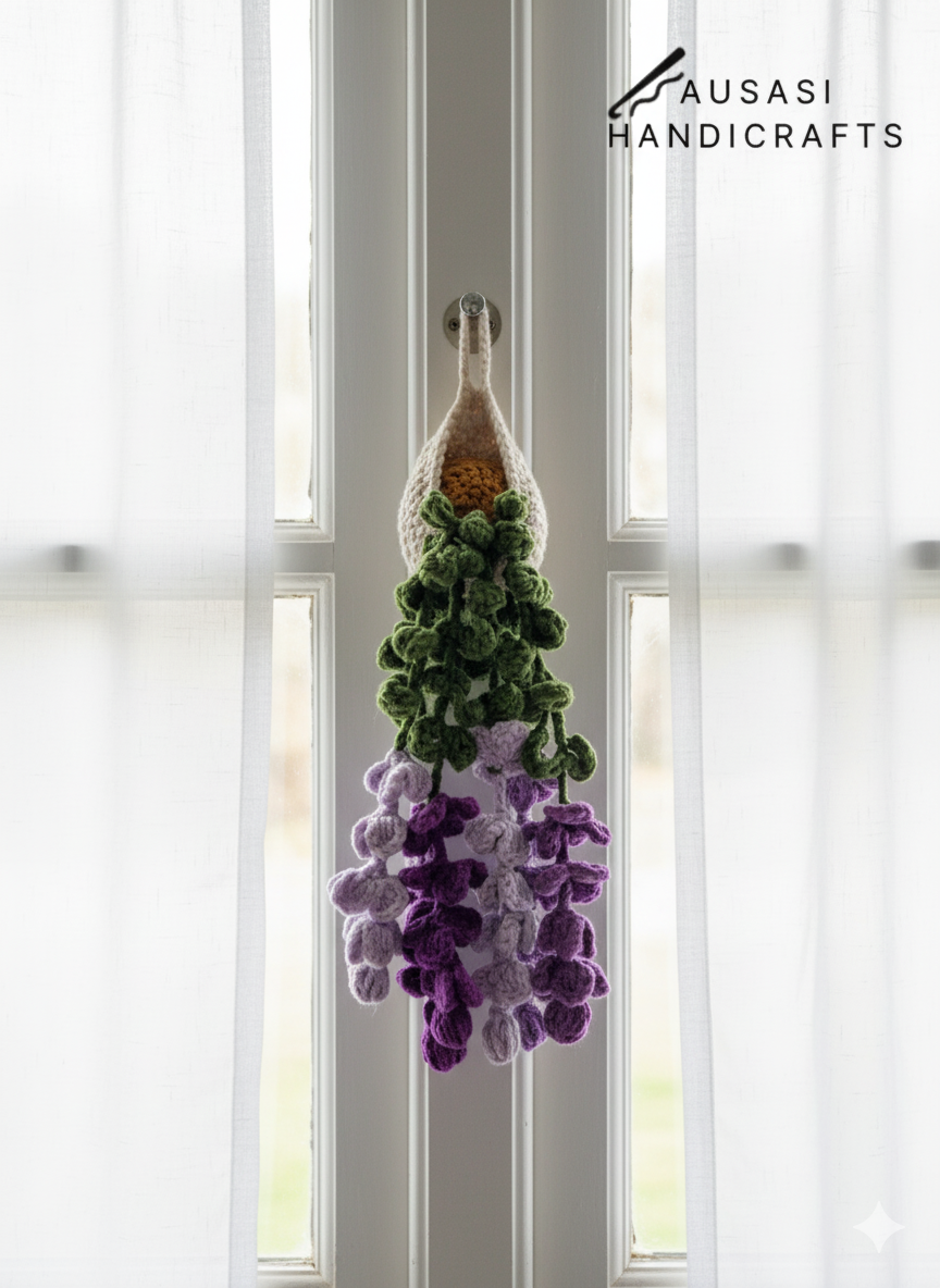 This is a handmade crochet hanging plant, carefully crafted with tight stitches and detailed leaf and flower patterns. The gradient of green to Purple tones gives it a fresh, natural look.