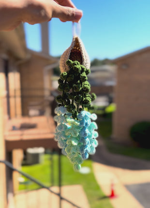 This is a handmade crochet hanging plant, carefully crafted with tight stitches and detailed leaf and flower patterns. The gradient of green to blue tones gives it a fresh, natural look.