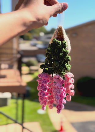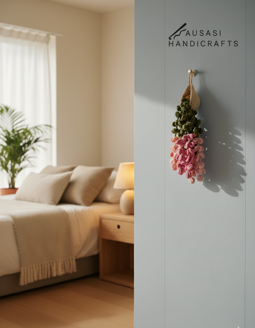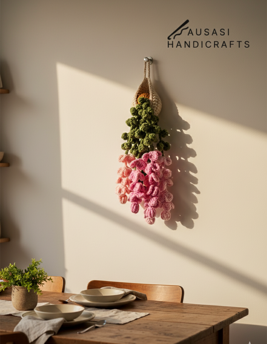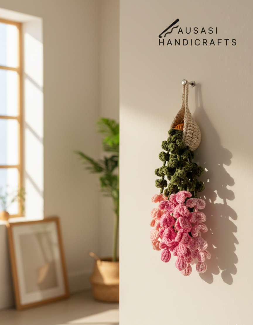 This is a handmade crochet hanging plant, carefully crafted with tight stitches and detailed leaf and flower patterns. The gradient of green to pink tone gives it a fresh, natural look.