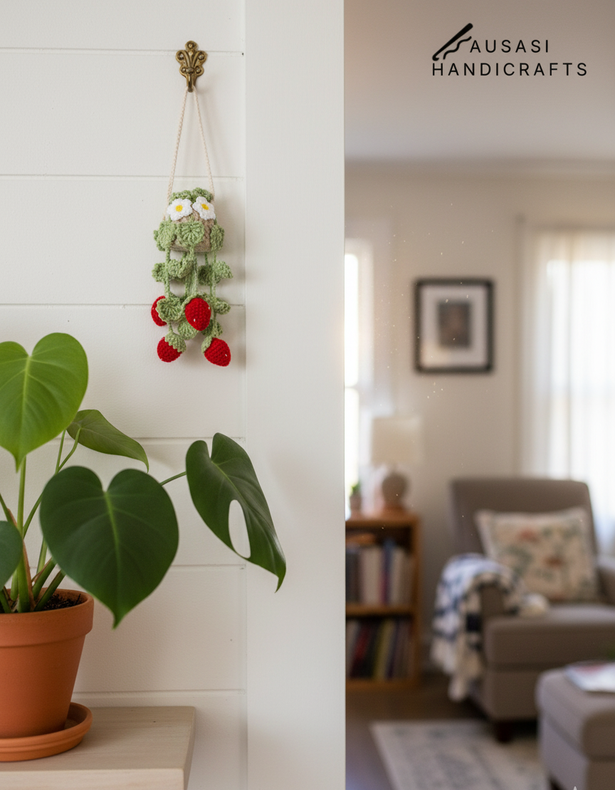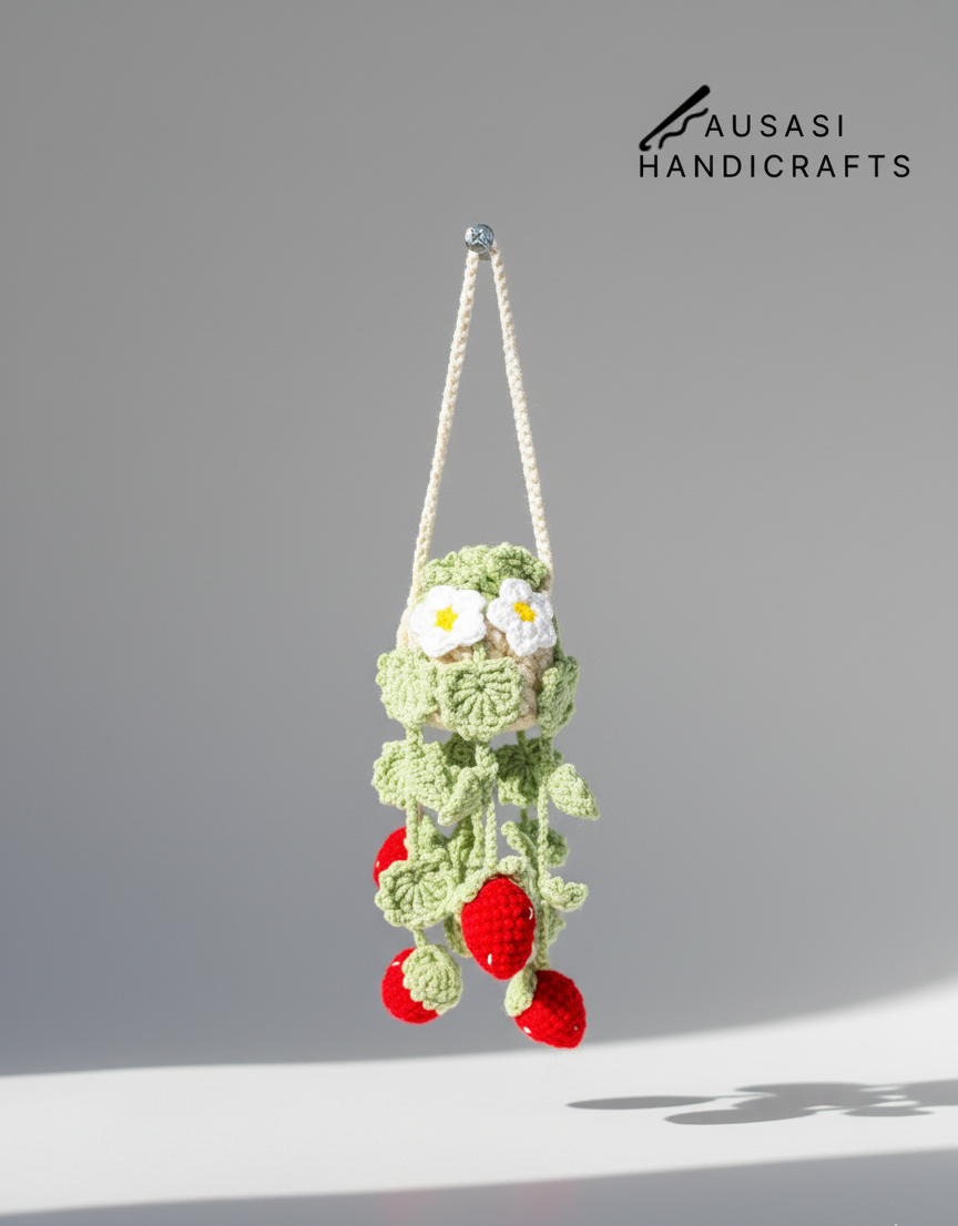This is a handmade crochet Strawberry plant, carefully crafted with tight stitches and detailed leaf and flower patterns. The gradient of green to red tones gives it a fresh, natural look.
